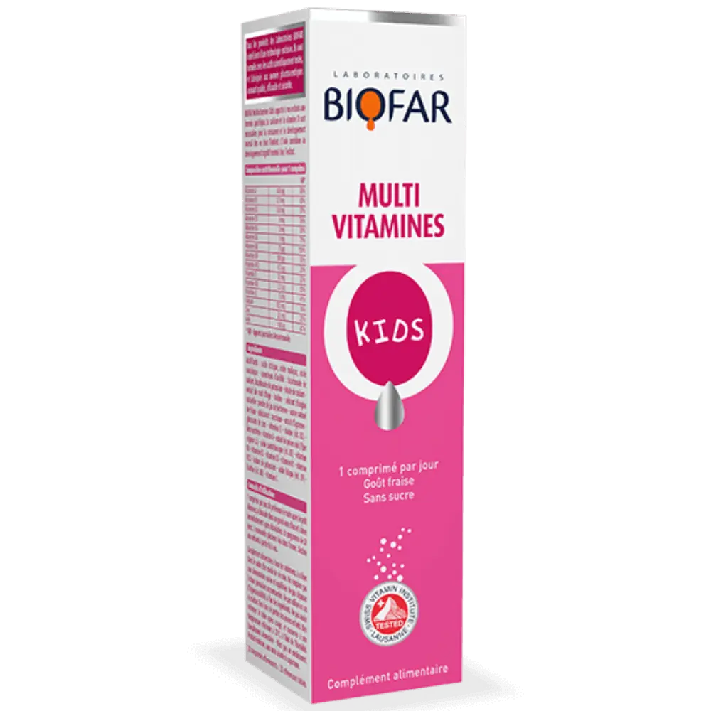 Les Laboratoires Biofar ont développé « Multivitamines Kids », une formule riche et complète au goût naturel de fraise, spécialement conçue pour vos enfants. Des dosages optimaux et équilibrés, des vitamines essentielles pour les enfants, des minéraux organiques (calcium, zinc)… Les Laboratoires Biofar ont réuni les éléments nécessaires à la vitalité quotidienne de votre enfant. En effet : le calcium et la vitamine D sont nécessaires pour la croissance et le développement normal des os chez l’enfant, l’iode contribue au développement cognitif normal chez l’enfant. Multivitamines Kids est un complément alimentaire adapté à l’enfant dès 6 ans.