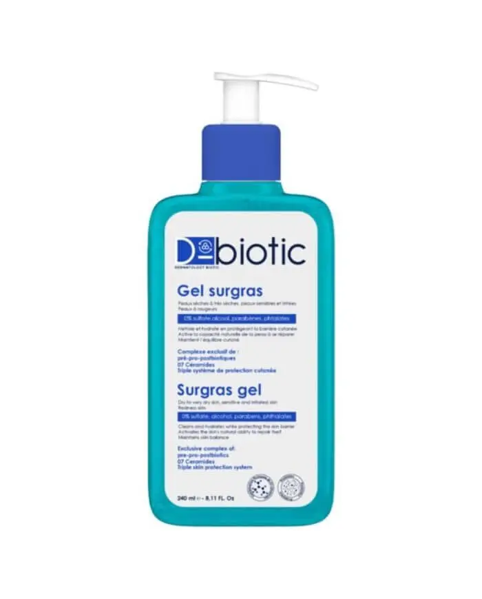 D-Biotic gel nettoyant surgras est un gel à base d’uncomplexe spécifique de sept (07) Céramides, desactifs probiotiques et actifs ultra hydratants, aide lapeau à retrouver son équilibre naturel, favorise à renforcer l’écosystème cutané.