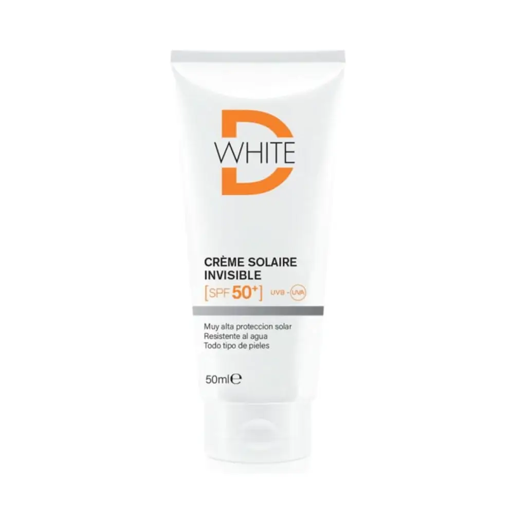 DWHITE CREME SOLAIRE SPF50 50mL Invisible et teinté est une émulsion facile à étaler, spécialement conçue pour les peaux très sensibles au soleil. Cette crème est formulée avec une combinaison de filtres organiques et minéraux dont le rôle est de protéger la peau contre les rayons UVA et UBV, responsables des coups de soleil, des tâches pigmentaires et du vieillissement prématuré de la peau. L’assimilation dans la formule, d’Aloe Vera et de la Vitamine E, riches en anti-oxydants, inhibe la production des radicaux libres et protège l’épiderme des dommages induits par les rayons UV.