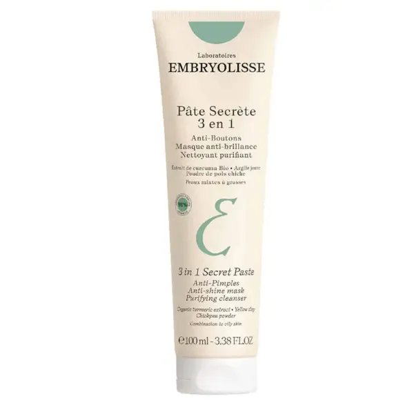 Embryolisse Pâte Secrète 3en1 100 ml est un soin anti-imperfections destiné aux peaux mixtes à grasses. Composé d’un extrait de curcuma Bio, d’argile jaune et de poudre de pois chiche, il est à la fois :