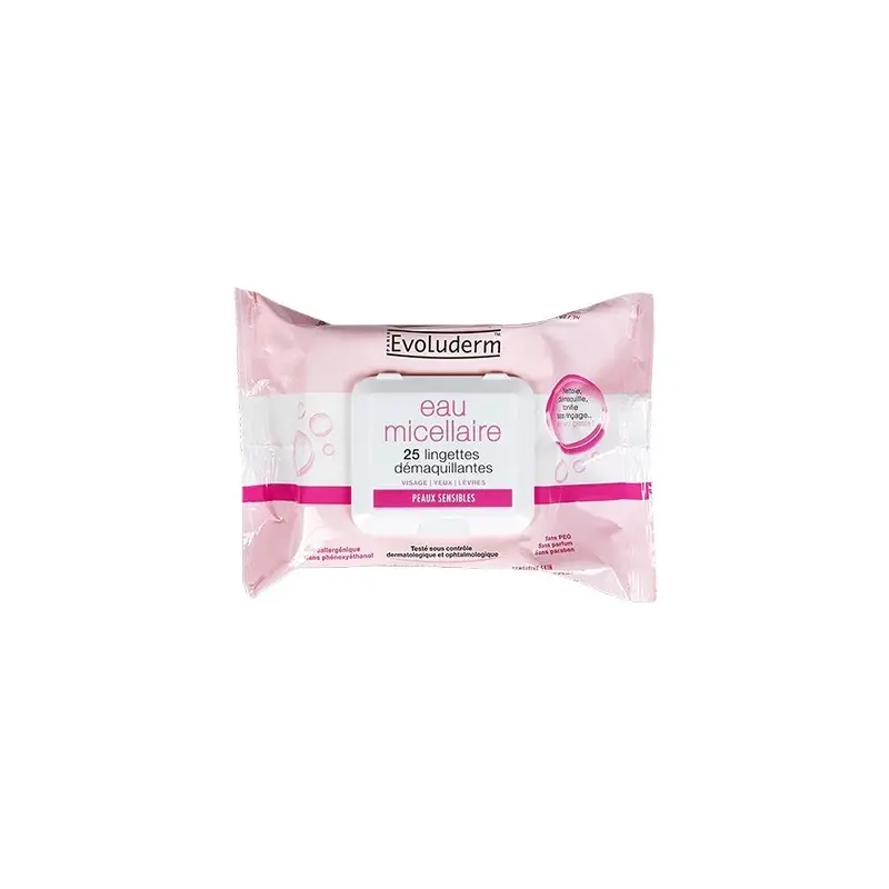 Lingettes démaquillantes à l’eau micellaire pour peaux sensibles 25 unités d’Evoluderm.