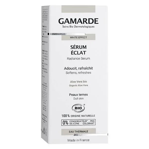 Gamarde White Effect Sérum Eclat Bio 30 ml est un soin à base d’Aloe vera et de réglisse qui adoucit, assouplit et rafraîchit les peaux ternes. Il associe également du céleri et du basilic qui illuminent le teint.