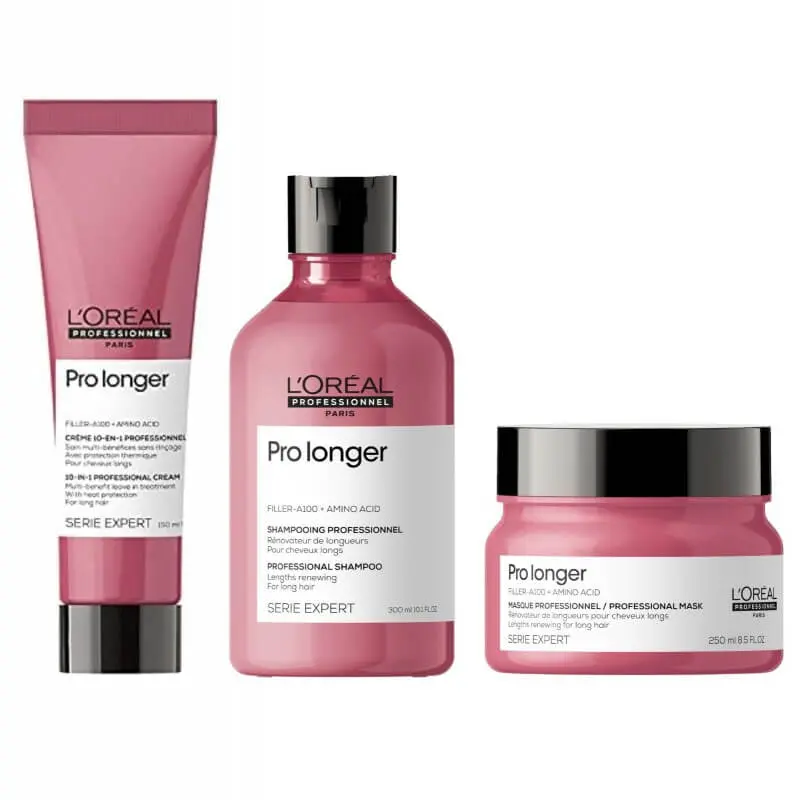 La gamme Pro Longer est enrichie en Filler A-100 pour renforcer la structure interne de la fibre et en Acide Aminé pour rénover les longueurs et les protéger contre la casse. Des formules professionnelles spécialement conçues pour répondre aux exigences des cheveux longs aux pointes affinées en apportant force et brillance à la fibre des racines jusqu’au pointes.