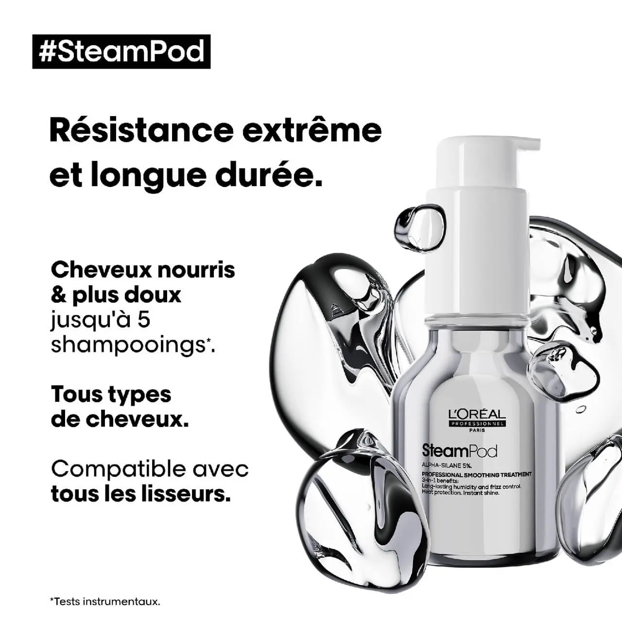 - COMPATIBLE AVEC TOUS LES LISSEURS : S’utilise sur tous types de cheveux, avant le lissage, avec tous types d’outils lissants ; Pour des résultats optimaux, utiliser avec SteamPod