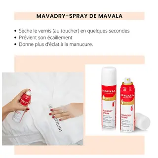 Produit indispensable pour les femmes occupées d’aujourd’hui, MAVADRY SPRAY sèche le vernis à ongles en quelques secondes (sec au toucher), évite l’écaillage et rend la manucure plus brillante.