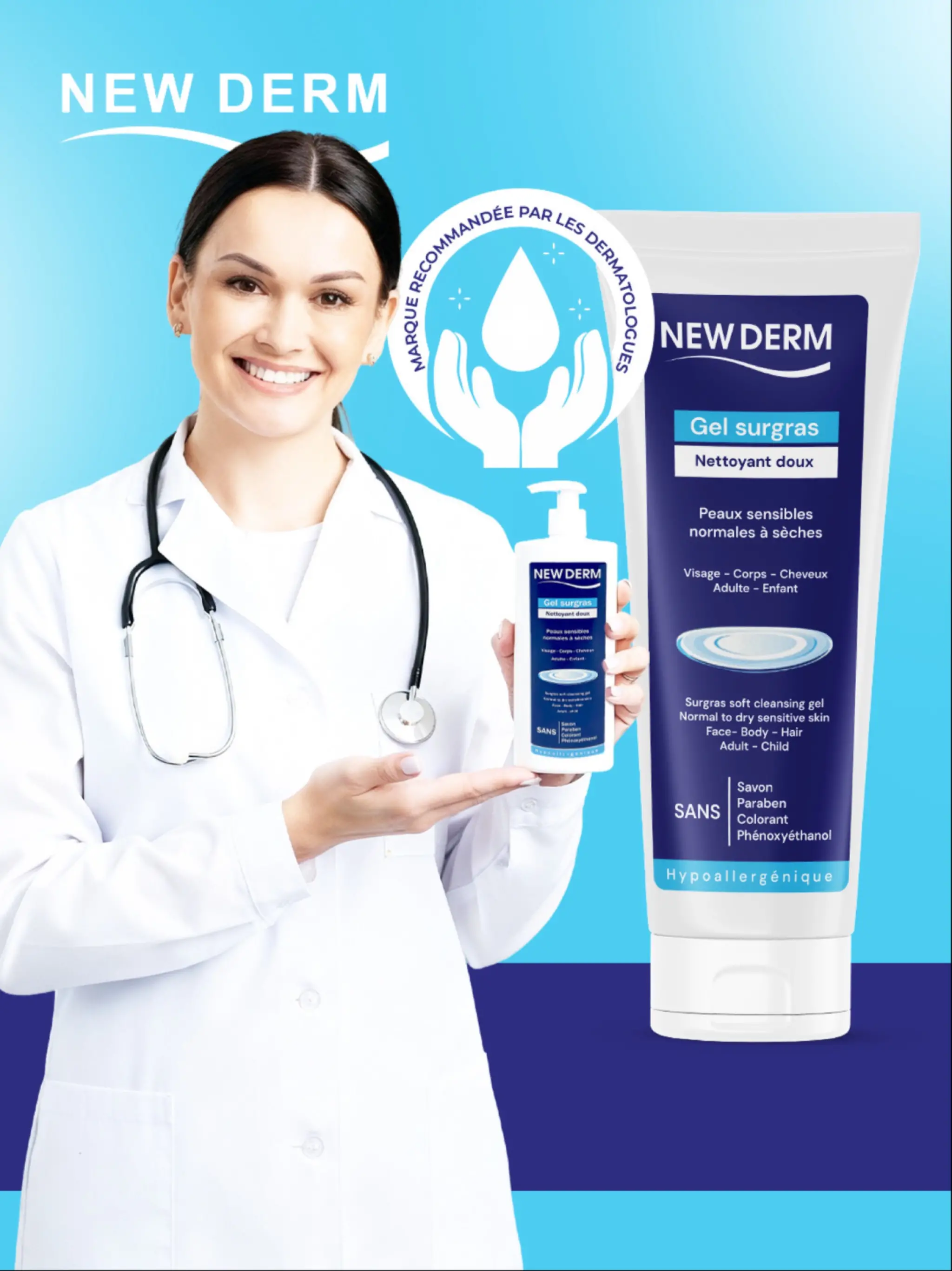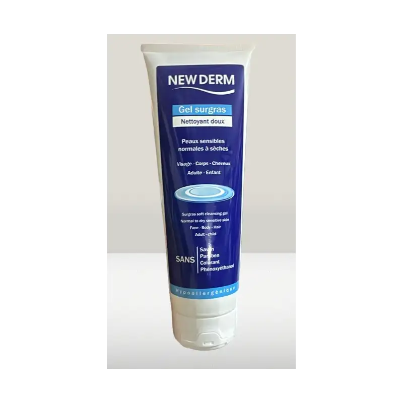 NEW DERM Gel surgras Nettoyant doux 250ml, est un nettoyant doux pour les peaux sensibles normales à sèches.