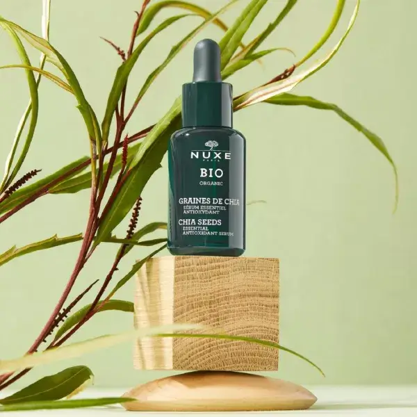 Sérum essentiel antioxydant Nuxe Bio, un soin anti-âge rafraîchissant pour le visage, concentré des pouvoirs antioxydants issus de la Graine de Chia, qui permet de lutter contre les radicaux libres responsables du vieillissement prématuré de la peau.