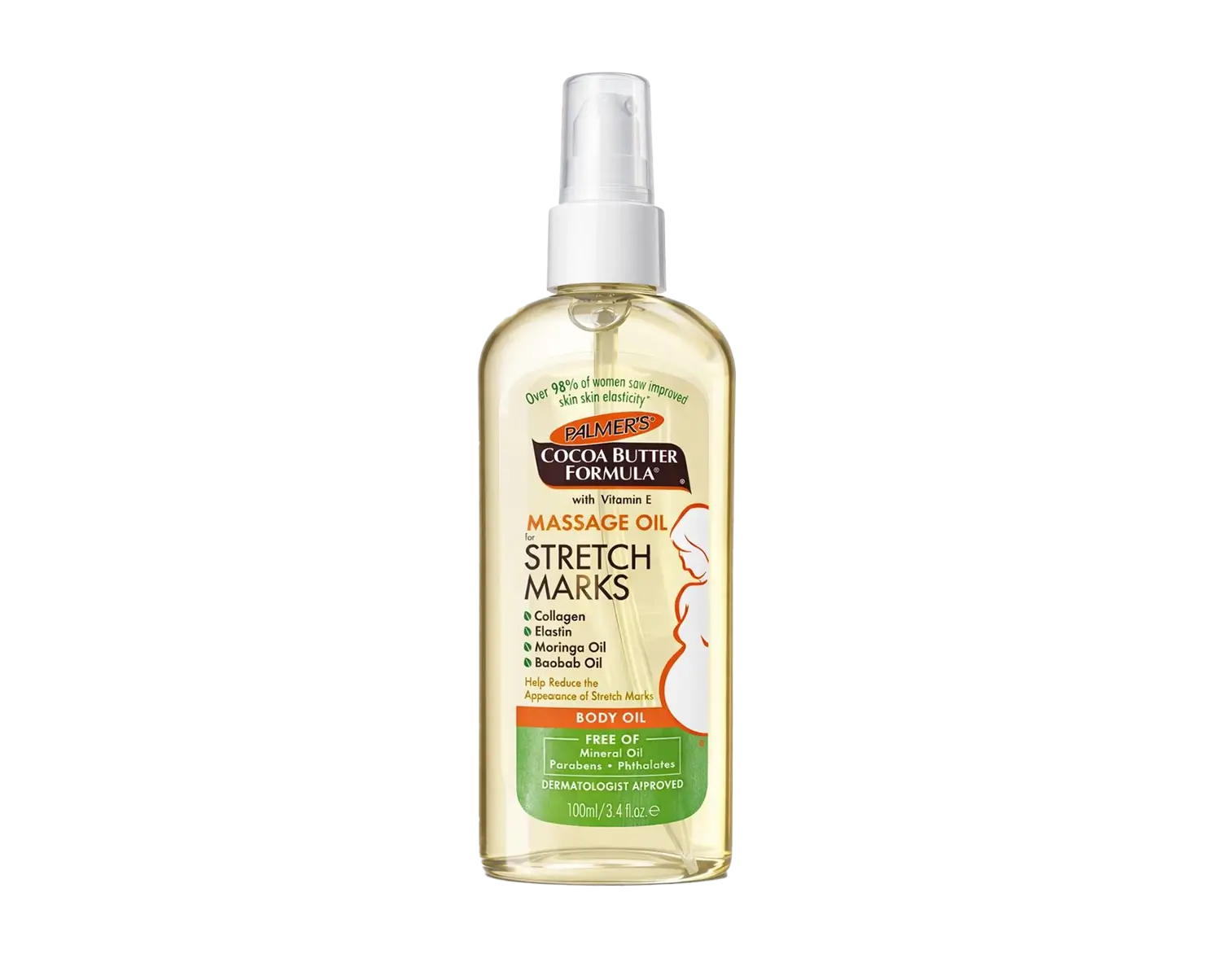Palmer’s Cocoa Butter Formula Massage Oil for Stretch Marks est une huile corporelle spécialement formulée pour aider à améliorer l’élasticité de la peau et à réduire l’apparence des vergetures. Enrichie en beurre de cacao pur, vitamine E, collagène, élastine et huiles naturelles comme le moringa et le baobab, elle nourrit intensément la peau et aide à maintenir sa souplesse.